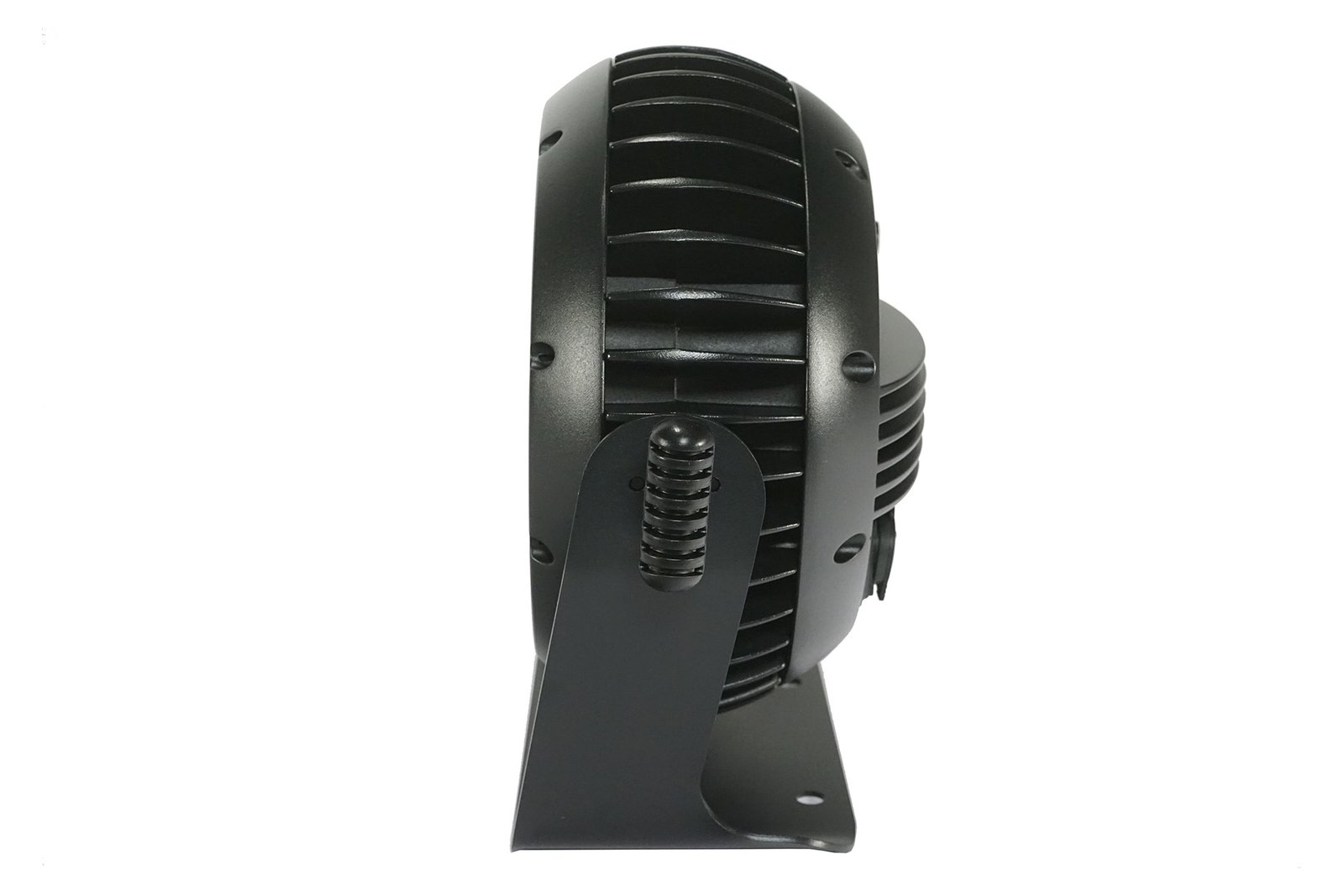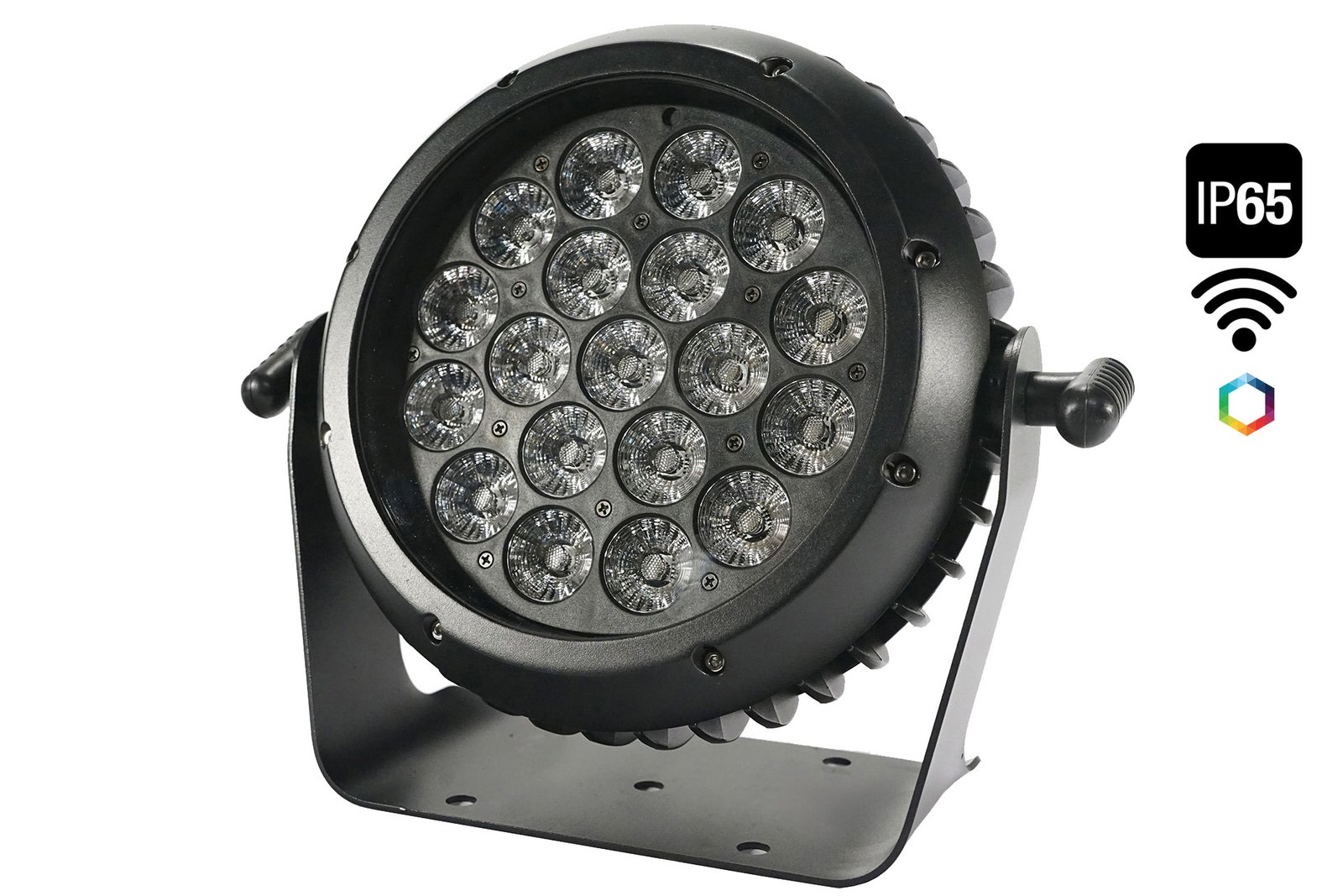 Contemporary IP65 led par with Wireless DMX operation and amazing color mixing, 19 LEDS 12 watts RGBW + Amber + UV, 26 degrees beam angle, 0-100% linear dimmer, flicker-free, 3 pixels rings, strobe effect with 1-25T /s, 22/10 DMX channel, IP rated power and DMX connector IN/OUT, Dual mounting brackets for installation/floor stand, Built, noise-free aluminum cooling system, built-in programs, and macro effects. 4.7 kg