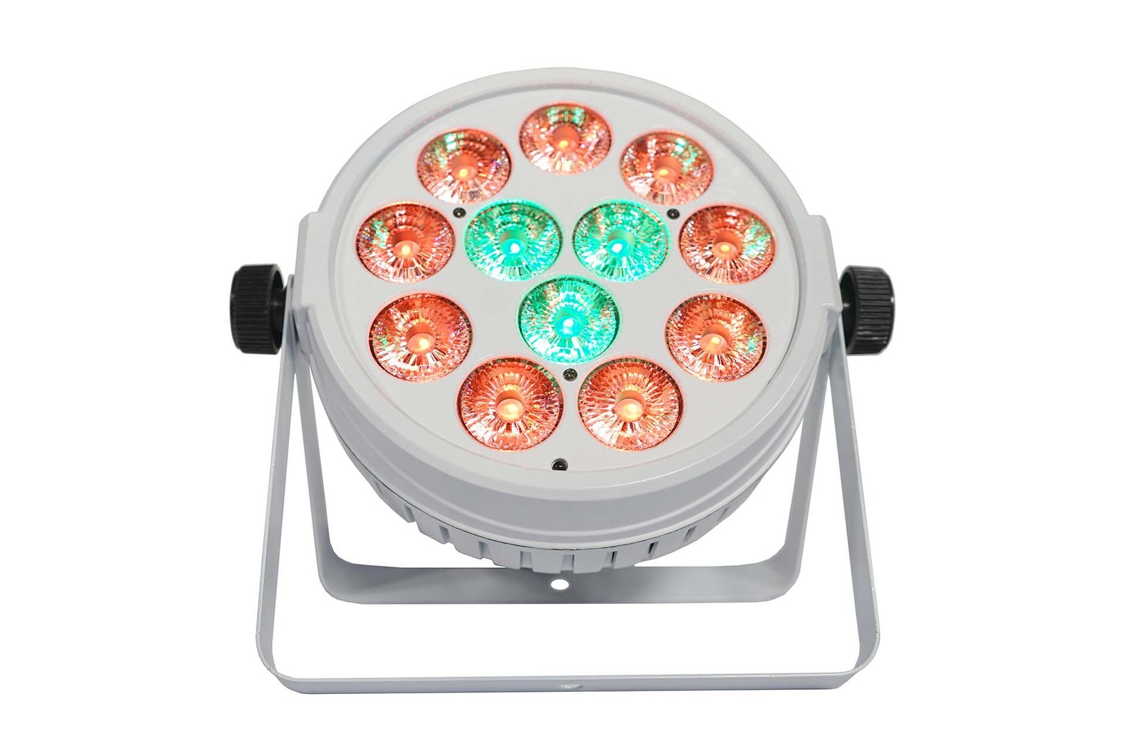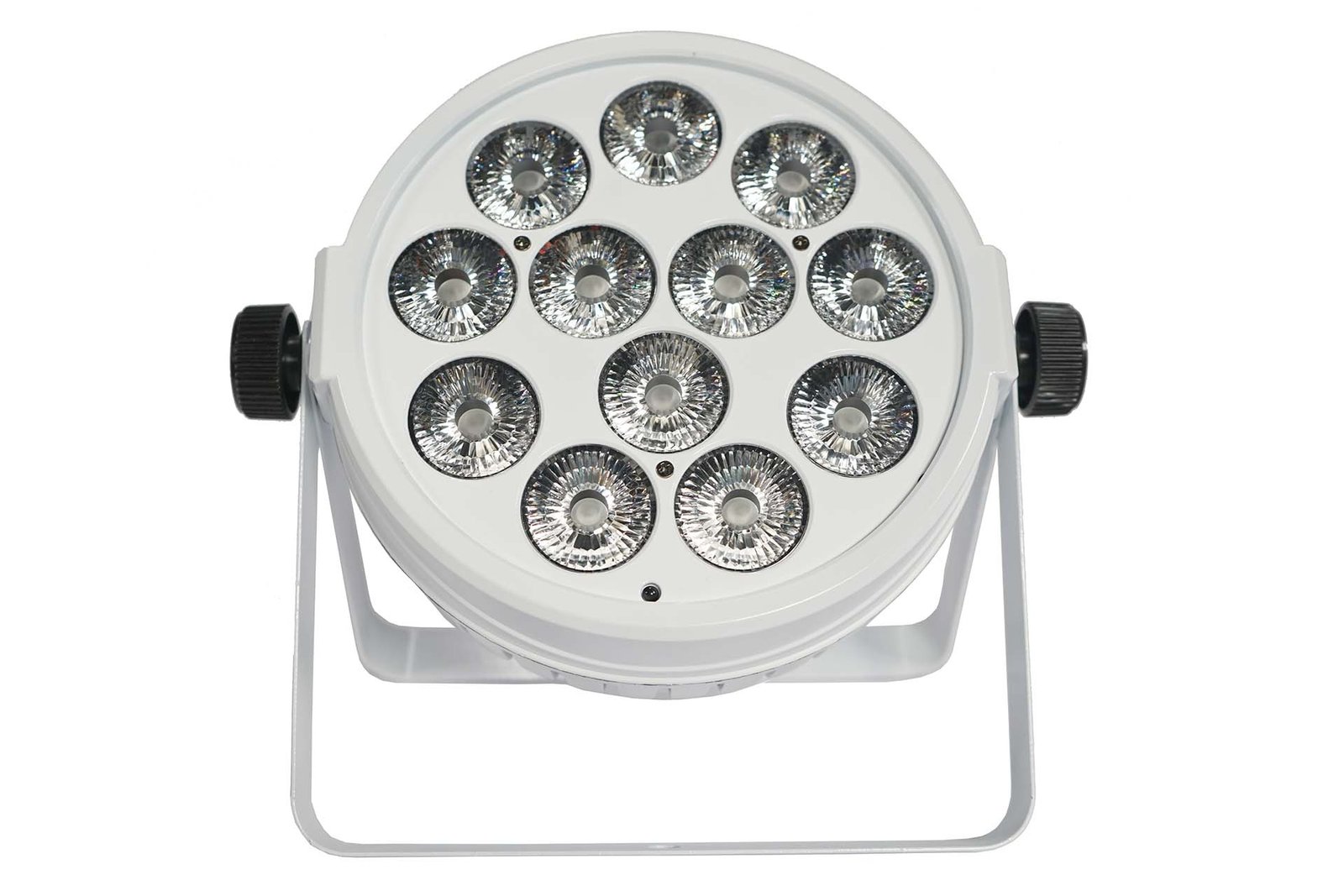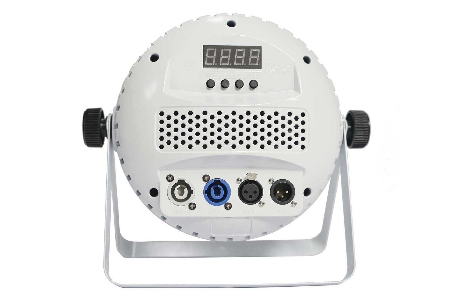 Professional white housing Par, 12 Led 12 watt RGBW 4in1, 25 digress optic system, 18/10 DMX channels, IR remote, Engineering grade nylon plastic, flame retardant and corrosion resistant, Built-in programs, 0-100% electronic dimming, POWERCON connector IN/OUT, 4-button LED display on rear panel , 2 kg