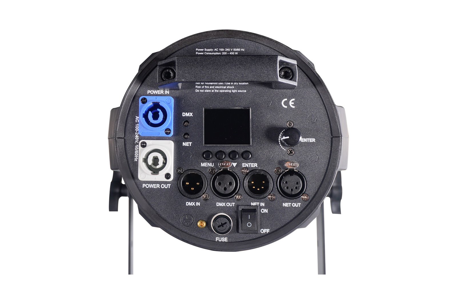 This professional lighting fixture offers 16-bit dimming via DMX, ensuring smooth and precise control over light intensity. Flicker-free operation with selectable PWM guarantees optimal performance. The Powercon in & out connectors provide convenient power supply options. The color LCD display allows for easy navigation and control.