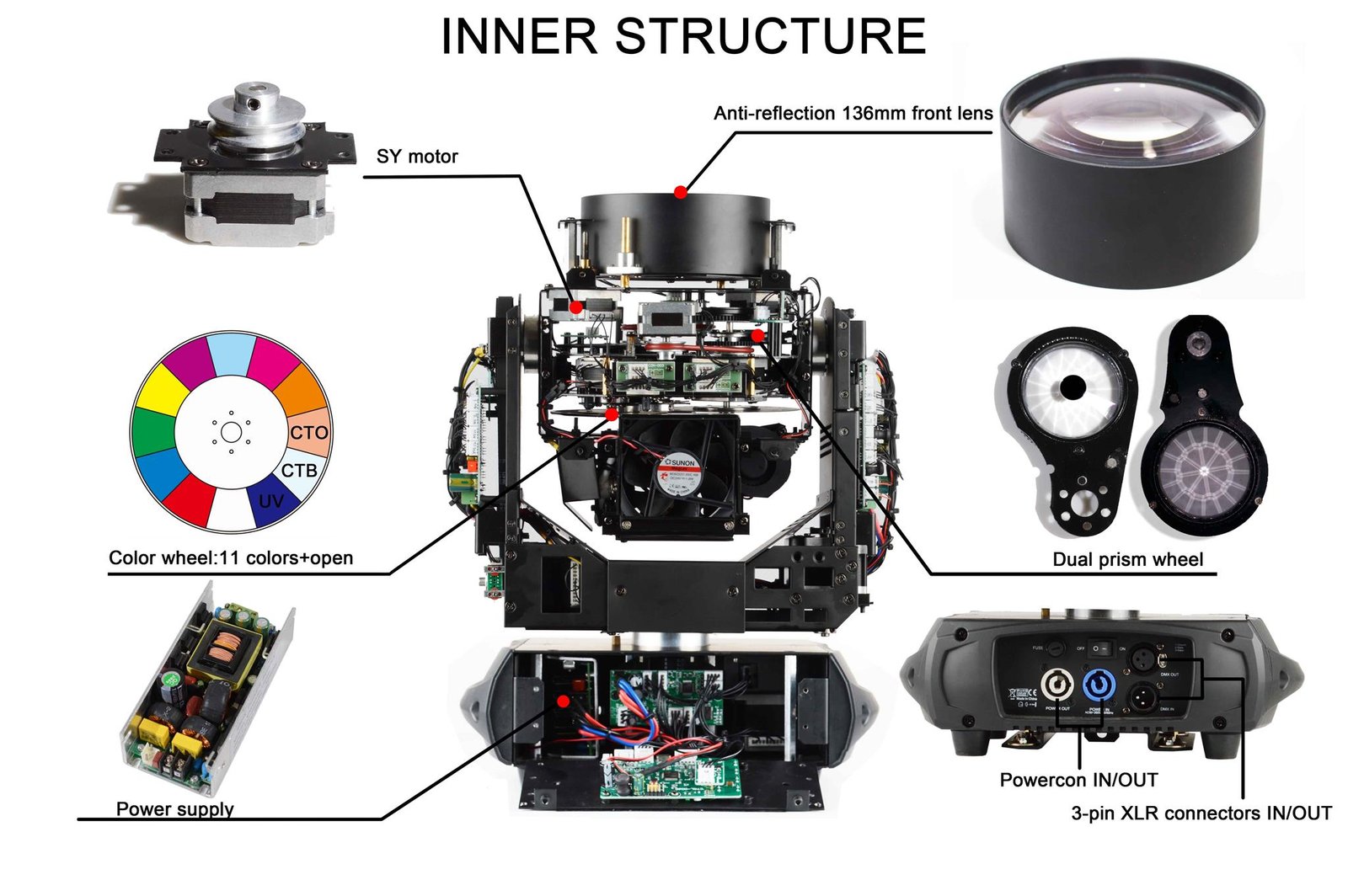 Professional Beam with Super Prisms (16 facet+24 facet prism) and powerful, ultra bright OSRAM 7R Lamp (2000 hours) , 3 phase P/T motors , Solid Beam angle: 2.5? ,Anti-reflection 136mm front lenses , Control Channel:14/16 DMX ,11 colors , 16 gobos , Frost filter, Motorized focus from near to far (2.5M-30M) , 13.2kgs.