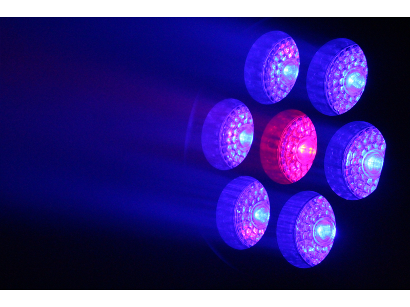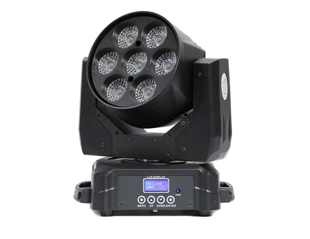 Wash moving head , Zoom 15-50?,7 RGBW 15w 4in1 LEDs, Preset color macros , Pixel Control ,Dimmer: 0-100% linear dimming,stop/strobe effect, 22 DMX channels, 6 kg